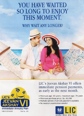 (UIN: 512N234V06) (A Single Premium Non-Linked, Without-Profit, Immediate Annuity Plan) 1. Introduction It is an Immediate Annuity plan, which can be purchased by paying a lump sum amount. The plan provides for annuity payments of a stated amount throughout the life time of the annuitant. Various options are available for the type and mode of payment of annuities. 2. Options Available The following options are available under the plan A) Type of Annuity: i) Annuity payable for life at a uniform rate. ii) Annuity payable for 5, 10, 15 or 20 years certain and thereafter as long as the annuitant is alive. iii) Annuity for life with return of purchase price on death of the annuitant. iv) Annuity payable for life increasing at a simple rate of 3% p.a. v) Annuity for life with a provision of 50% of the annuity payable to spouse during his/her lifetime on death of the annuitant. vi) Annuity for life with a provision of 100% of the annuity payable to spouse during his/her lifetime on death of the annuitant. vii) Annuity for life with a provision of 100% of the annuity payable to spouse during his/ her life time on death of annuitant. The purchase price will be returned on the death of last survivor. You may choose any one. Once chosen, the option cannot be altered. B) Mode: Annuity may be paid either at monthly, quarterly, half yearly or yearly intervals. You may opt any mode of payment of Annuity. 3. Benefits The amount of annuity is assured throughout life of the annuitant. What happens if the annuitant dies? If the annuitant dies: a) Under option (i) annuity ceases. b) Under option (ii) 1. On death during the guaranteed period – annuity is paid to the nominee till the end of the guaranteed period after which the same ceases. 2. On death after the guaranteed period – annuity ceases. c) Under option (iii) annuity ceases and the purchase price is paid to the nominee. d) Under option (iv) annuity ceases. e) Under option (v) annuity ceases and 50% of the annuity is payable to the surviving named spouse during his/her life time. If the spouse predeceases the annuitant, the annuity ceases. f) Under option (vi) annuity ceases and full annuity is payable to the surviving named spouse during his/her life time. If the spouse predeceases the annuitant, the annuity ceases. g) Under option (vii) annuity ceases. Full annuity is payable to the surviving named spouse during his/ her life time and purchase price is paid to the nominee after the death of the spouse. If the spouse predeceases the annuitant, the annuity ceases and purchase price will be paid to the nominee.